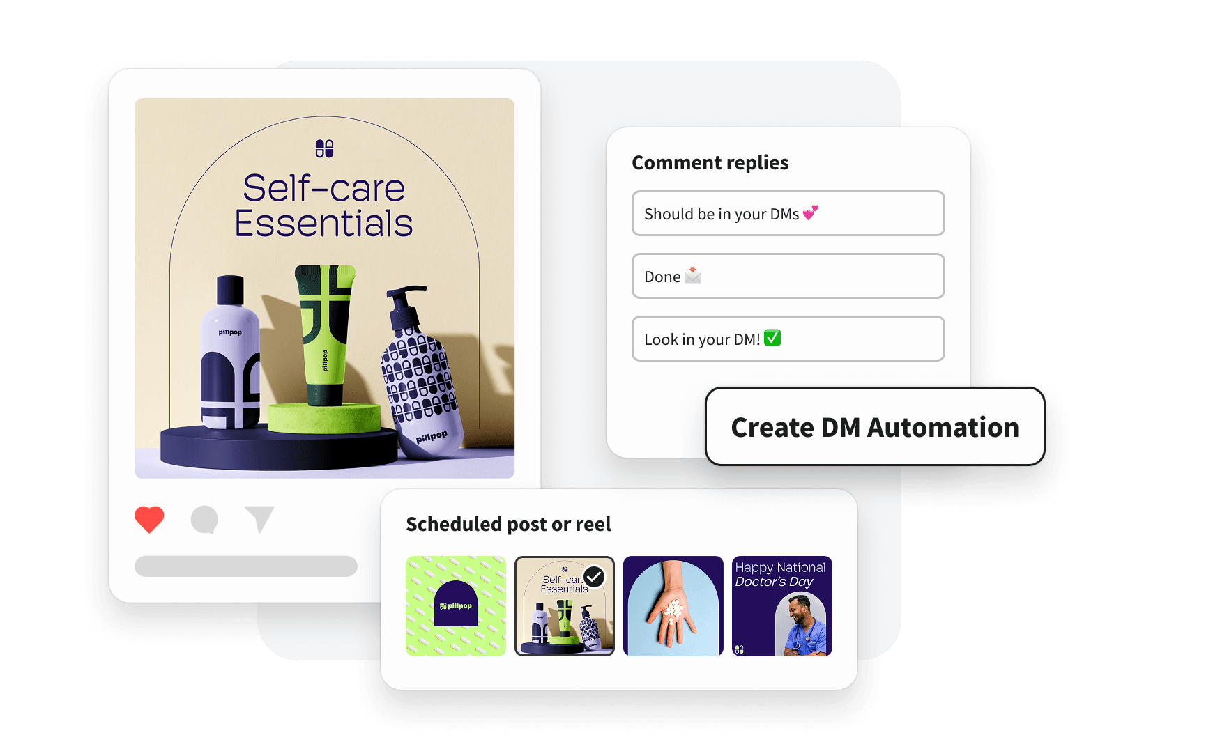 Social media interface showing comment replies, DM automation settings, and scheduled posts with self-care product images and National Doctor's Day content