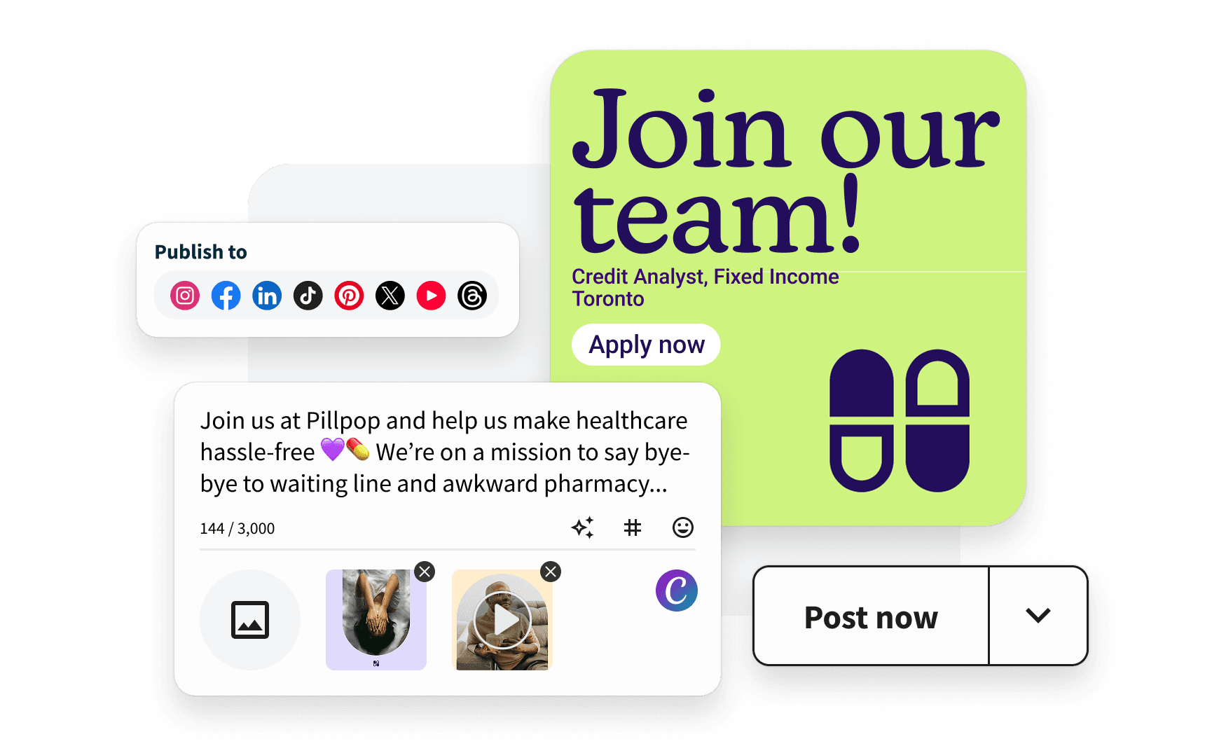 Schedule or publish social media posts across social media networks in one place. Instantly generate brand-approved captions, video scripts, creative briefs, and messages. Generate brand-approved copy and images or use built-in Canva and Adobe Express templates.
