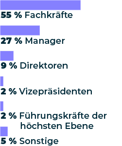 Ein Diagramm, das die „berufliche Position der Befragungsteilnehmer im Angestelltenverhältnis“ zeigt. Die Ergebnisse: 55 % Fachleute, 27 % Manager, 9 % Direktoren, 2 % Vizepräsidenten, 2 % C-Level-Führungskräfte und 5 % sonstige.Beschäftigungsart der Umfrageteilnehmer