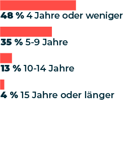 Ein Diagramm zur „Social-Media-Erfahrung der Befragungsteilnehmer“. Die Ergebnisse: 48 % 4 Jahre oder weniger, 35 % 5-9 Jahre, 13 % 10-14 Jahre und 4 % 15 Jahre oder mehr.Arbeitsort der angestellten Umfrageteilnehmer