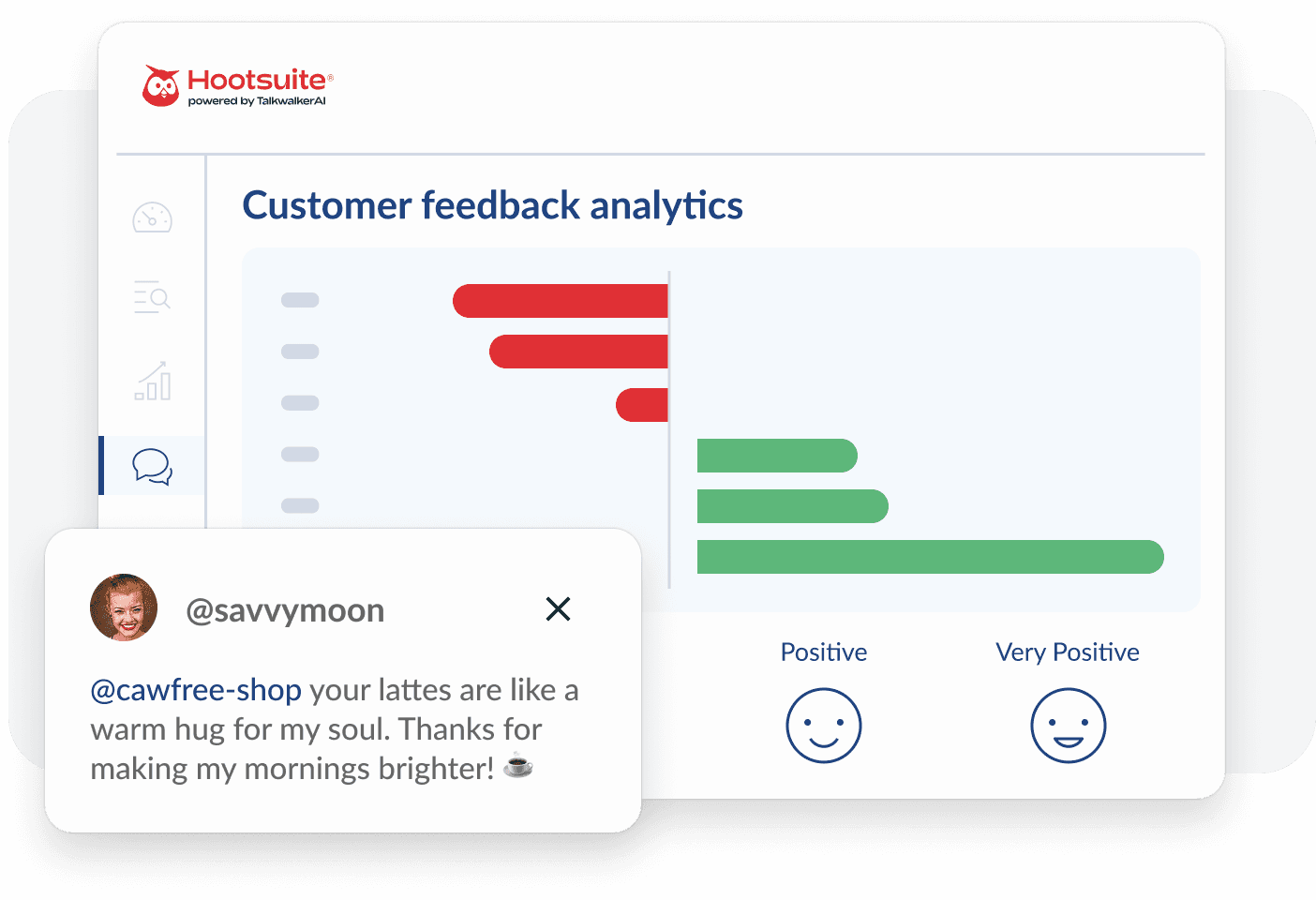 El mejor software de escucha de redes sociales es aquel que te ayuda a rastrear todo lo que la gente dice sobre tu marca sin tener que profundizar en la información. Con la monitorización de redes sociales de Hootsuite, obtienes una vista panorámica de la conversación y el sentimiento que rodea a tu marca, competidores e industria. Con la IA integrada y la búsqueda rápida de Talkwalker, ya no tendrás que buscar información clave. Todo está disponible en el panel de control de Hootsuite.