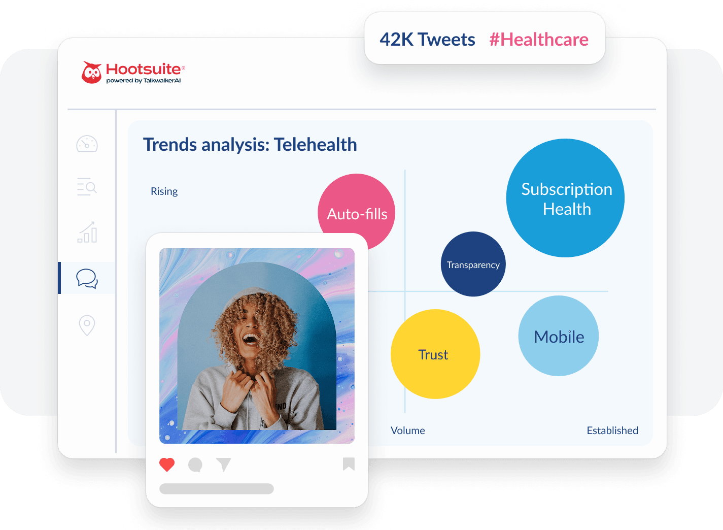 Detecta los riesgos temprano, observa qué está funcionando y adelántate a tus competidores con las últimas tendencias. Talkwalker de Hootsuite es el software de escucha social que lo hace todo en un solo sitio.