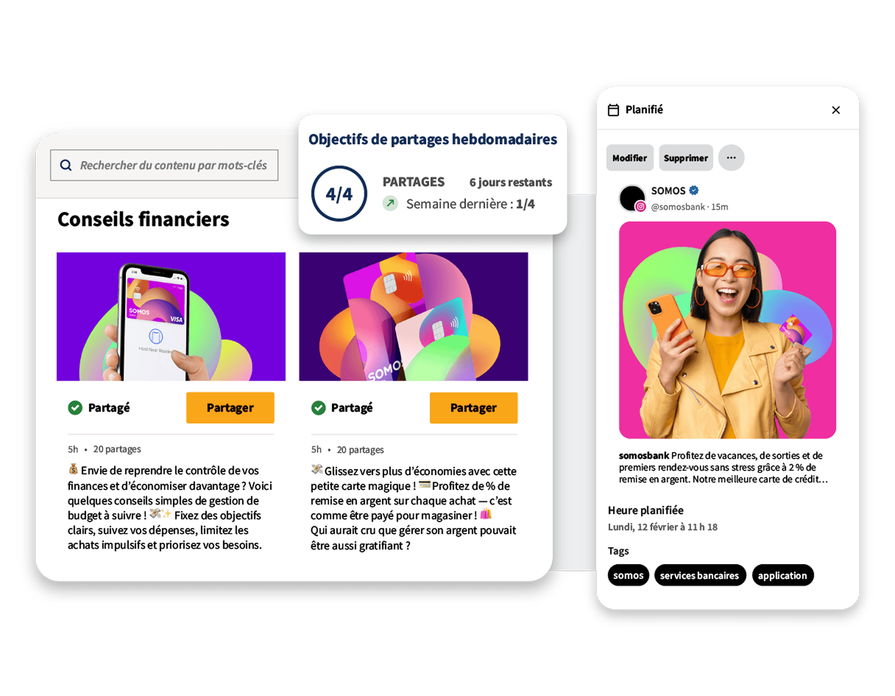 Renforcez la notoriété de votre marque et boostez votre présence sur les médias sociaux grâce à la plateforme de programme d'employés ambassadeurs d'origine. Hootsuite Amplify permet à vos employés de partager du contenu approuvé et fidèle à votre marque, ce qui augmente considérablement votre portée organique sur les médias sociaux.