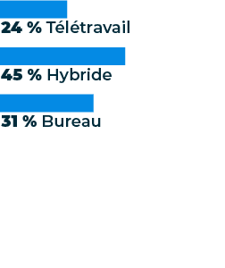 Graphique montrant le « lieu de travail des salariés ayant répondu à l'enquête », avec les résultats suivants : 24 % à distance, 45 % hybride et 31 % au bureau.