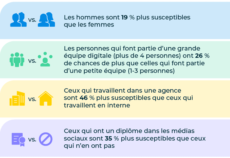 Les hommes qui font partie d’équipes de médias sociaux de quatre personnes ou plus sont 22 % plus susceptibles d’être promus que les femmes qui font partie d’équipes de la même taille. Il semblerait que les hommes aient l’avantage là aussi.