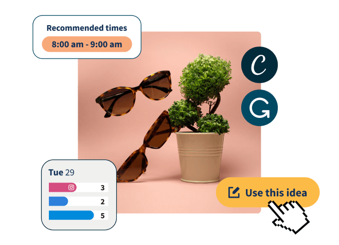 Preencha seu calendário de conteúdo com postagens atraentes em sintonia com a marca para todos os seus canais de mídia social em minutos